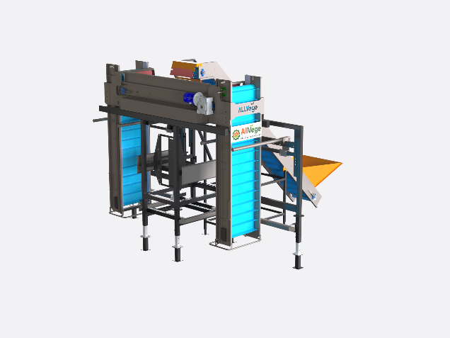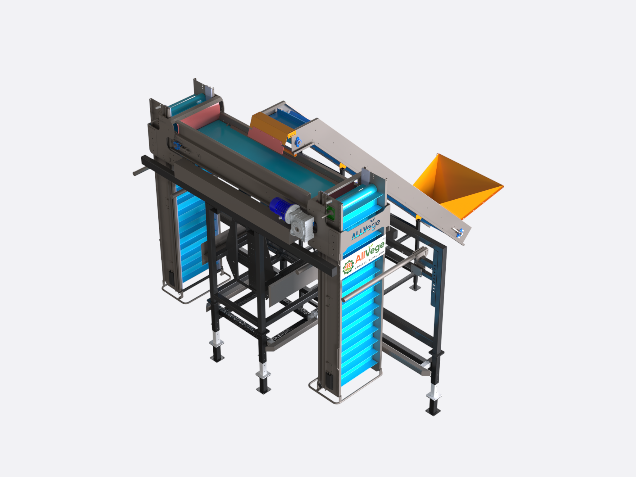 The vertical big bag filler from Allvege Process Technologies is used to fill big bags or boxes. Vertical belts are mounted on the frame to fill the big bags, along with a transport belt that allows a change in conveying direction. As the machine can hold two big bags or boxes, filling can continue without interruption. When hooks are installed, big bags can be filled; when the hooks are removed, boxes can be filled.