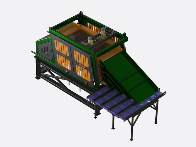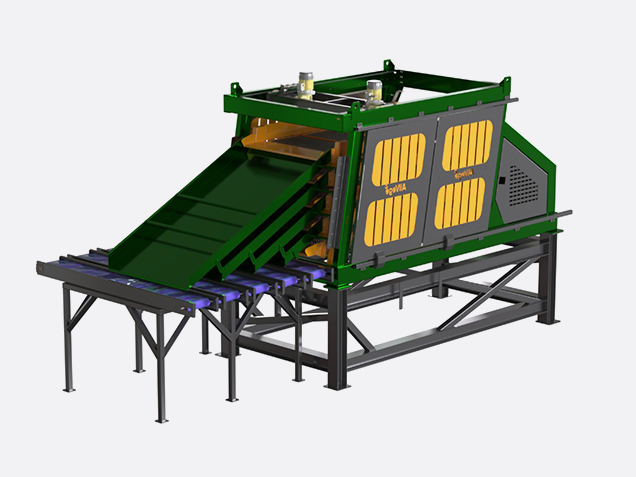 The Allround Shake grader from Allvege Process Technologies is designed to grade produce according to square size using four-dimensional grading. The produce is fed into the machine and distributed onto the top sieve. The sieves inside the machine operate with sequential shaking frequencies, allowing the produce to move along the sieve surfaces.